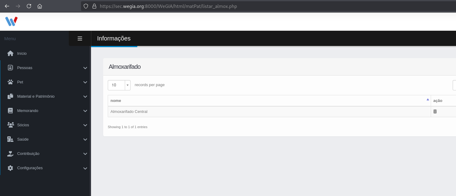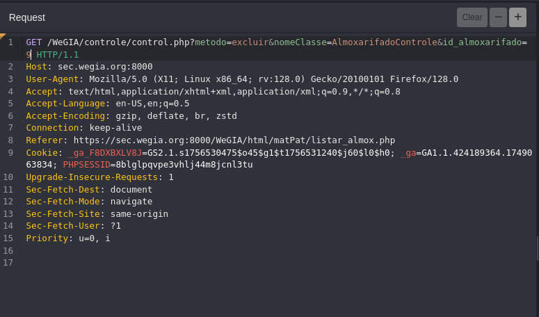 A Cross-Site Request Forgery (CSRF) vulnerability was identified in the WeGIA application. The delete operation for the Almoxarifado entity is exposed via HTTP GET without CSRF protection, allowing a third-party site to trigger the action using the victim’s authenticated session.