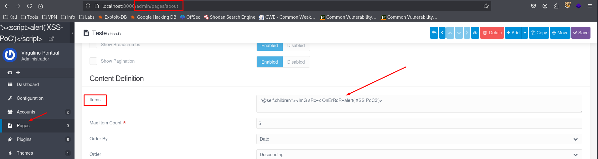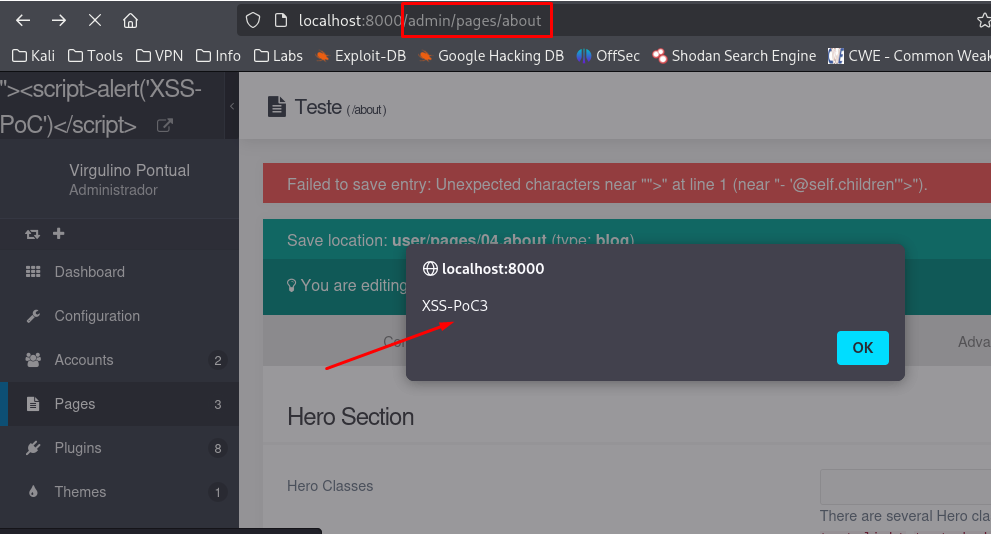A Reflected Cross-Site Scripting (XSS) vulnerability was identified in the /admin/pages/[page] endpoint of the Grav application. This vulnerability allows attackers to inject malicious scripts into the data[header][content][items] parameter.