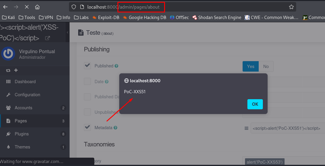 Multiples Stored Cross-Site Scripting (XSS) vulnerability was identified in the /admin/pages/[page] endpoint of the Grav application. This vulnerability allows attackers to inject malicious scripts into the data[header][metadata], data[header][taxonomy][category] and data[header][taxonomy][tag] parameters. These scripts are stored in the page frontmatter and executed automatically whenever the affected page is accessed or rendered in the administrative interface.