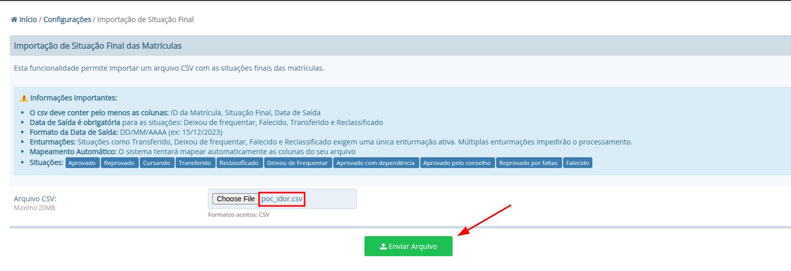 The attacker navigates to the Final Status Import tool. By uploading the CSV, they trigger the vulnerable service. The backend processes the IDs without validating institutional ownership.