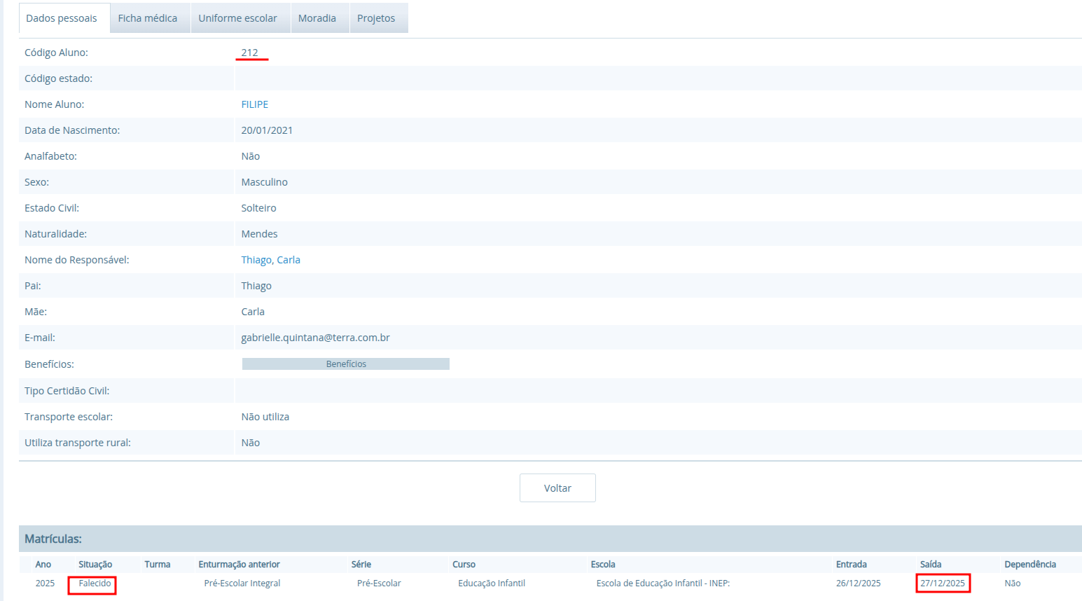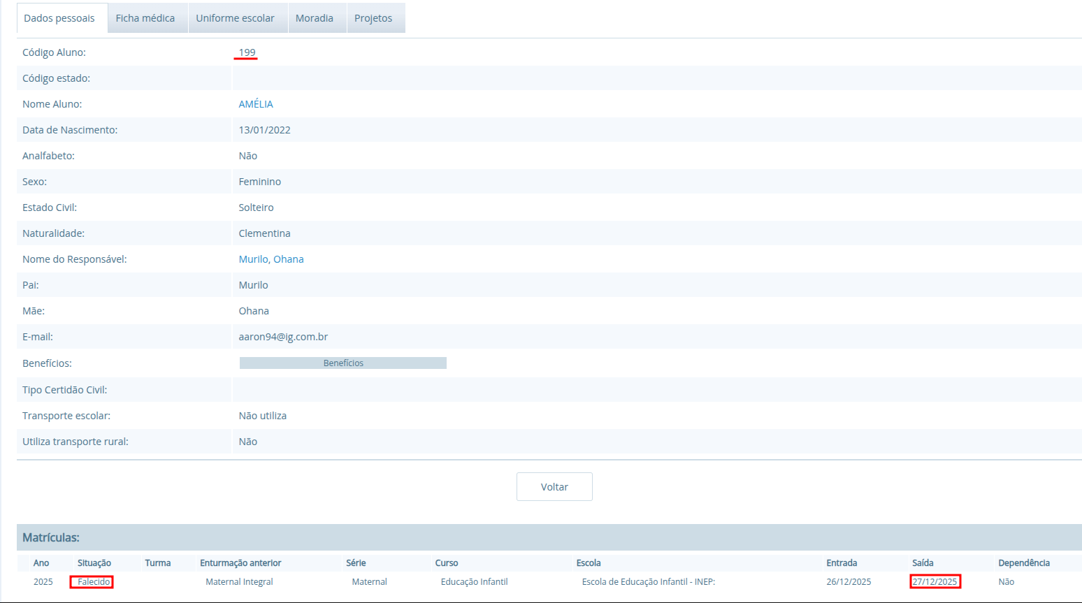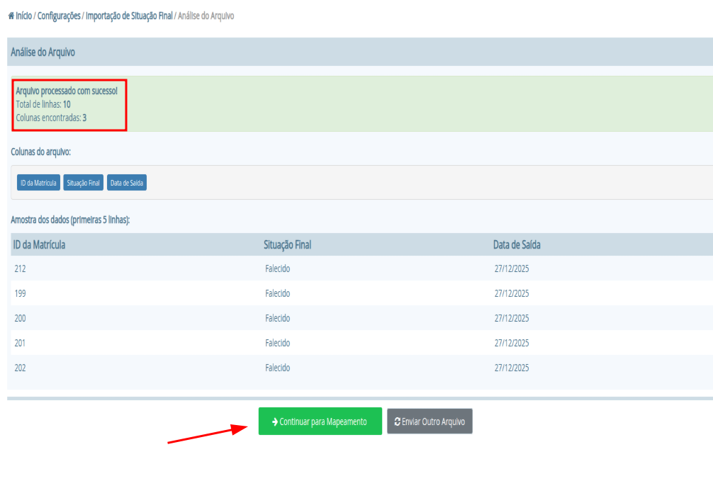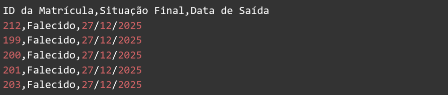 The attacker identifies student IDs from other institutions (e.g., IDs 212, 199, 200). A CSV payload is prepared to force a status change to "Falecido" (Deceased).